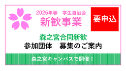 大学祭・新歓 2026年度森之宮合同新歓のご案内 学生自治会では、2026年度新歓事業の一環として、4月に「森之宮合同新歓」を森之宮キャンパスにて実施いたします。これに合わせて、参加団体を募集いたします。ビラの配布について「新歓花道」「森之宮合同新歓」ではビラの配布が可能ですが、3月6日(... 2026.02.16 大学祭・新歓