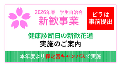 大学祭・新歓 2026年度新歓花道のご案内 学生自治会では、2026年度新歓事業の一環として、健康診断日に新歓花道を実施いたします。ビラの配布について「新歓花道」「森之宮合同新歓」ではビラの配布が可能ですが、3月6日(金)までに事前の手続きを済ませる必要があります。詳細(手続きや重要... 2026.02.14 大学祭・新歓